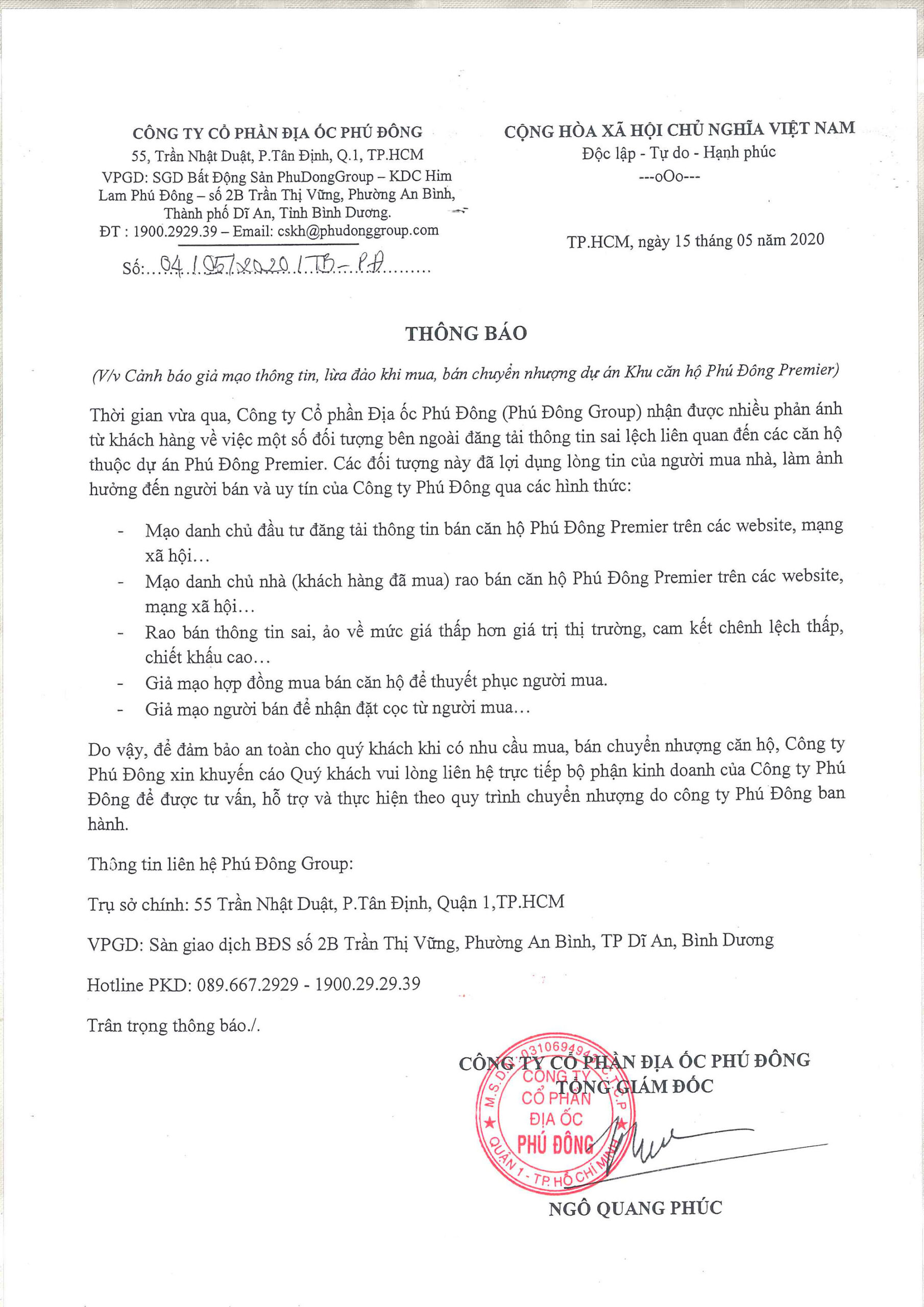 Về phía chủ đầu tư, Phú Đông Group cảnh giác Quý khách hàng thận trọng trước những thông tin mua, bán chuyển nhượng dự án Phú Đông Premier do môi giới đăng tải trên mạng. Để tránh những hành vi lừa đảo, công ty khuyến nghị Quý khách hàng liên hệ đến các kênh thông tin chính thống của công ty Phú Đông cũng như Bộ phận kinh doanh để được tư vấn và mua sản phẩm.