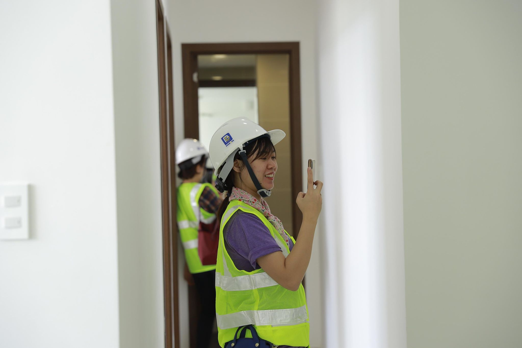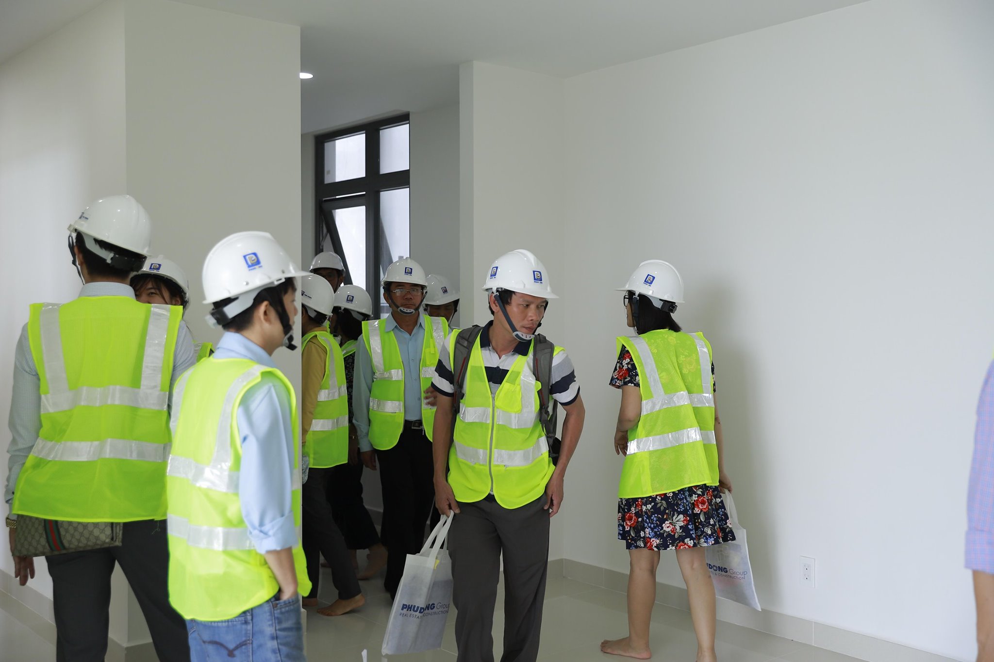 Căn hộ thật hoàn thiện ngay tại tầng 8. Mặc dù công trình đang thi công nhưng Phú Đông Group vẫn bố trí lực lượng nhân sự hướng dẫn khách hàng vào bên trong công trường tham quan và nghiệm thu chất lượng căn hộ hoàn thiện. Hoạt động này giúp người mua căn hộ có thể biết được dáng vóc căn nhà tương lai của mình.