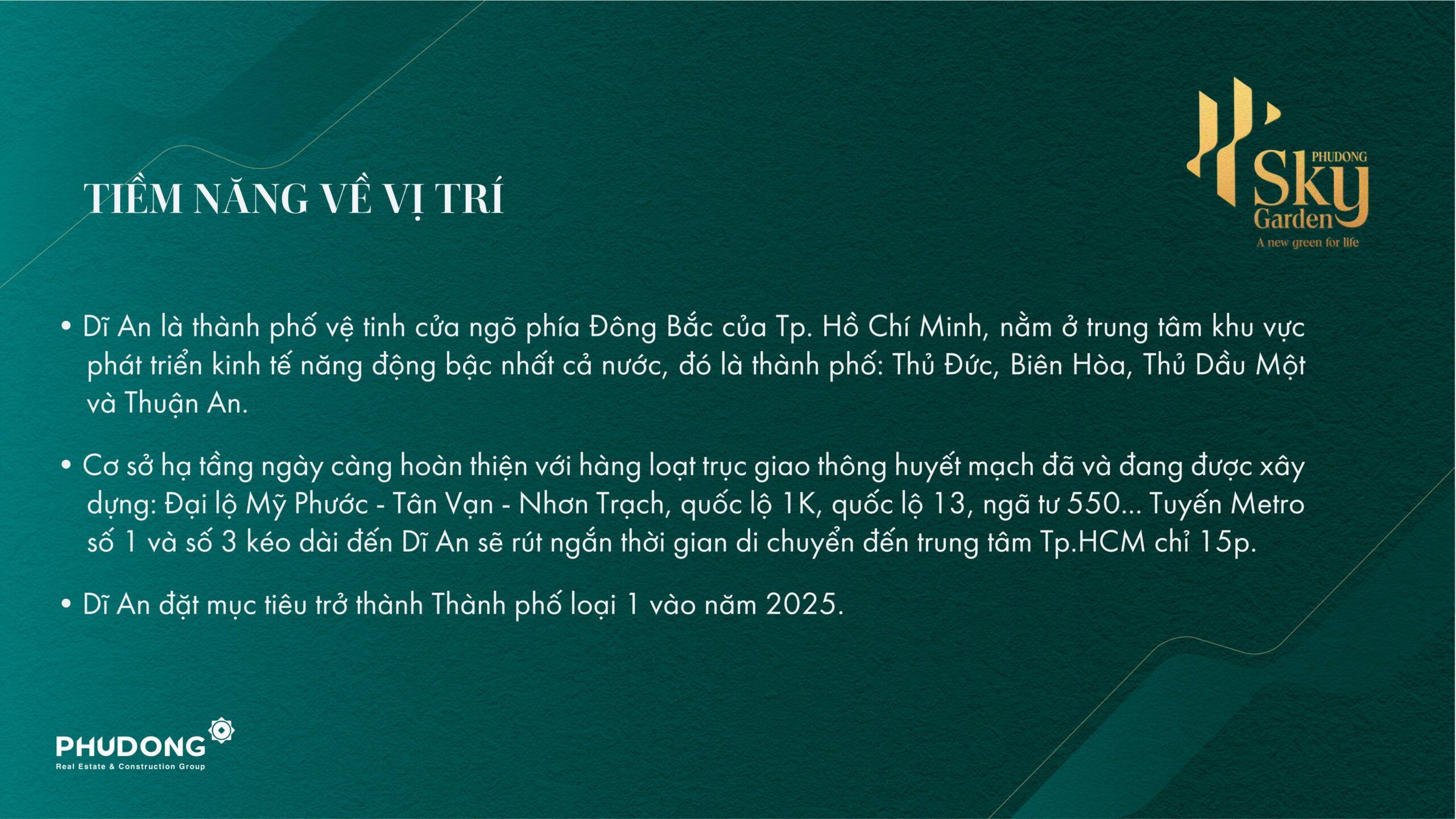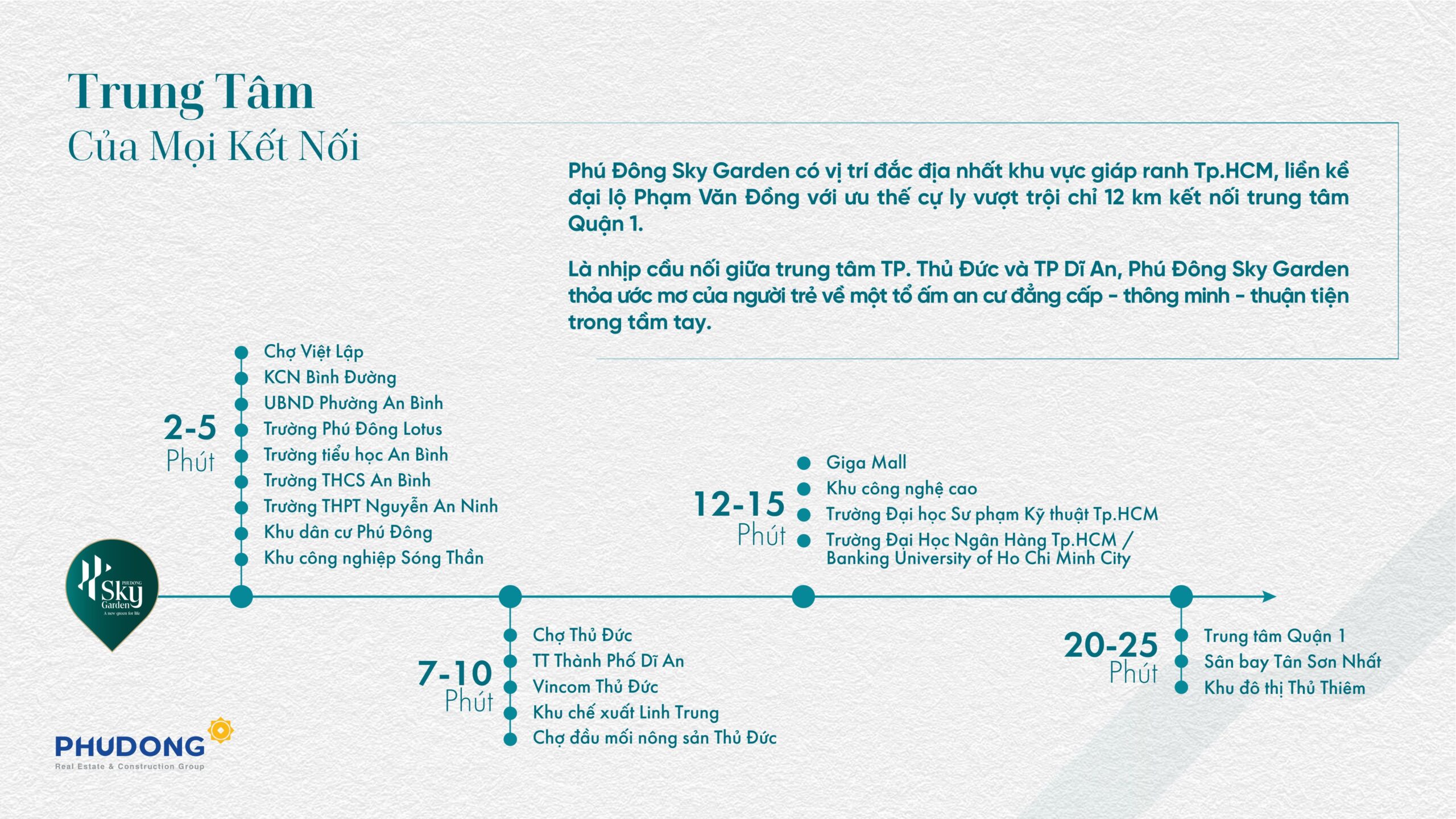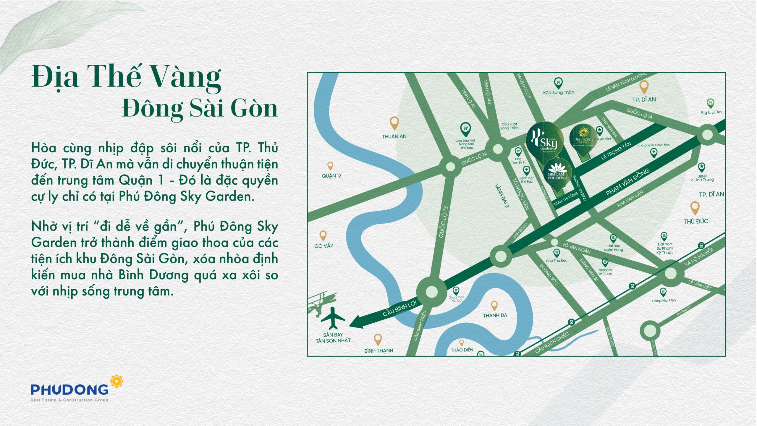 Phú Đông Sky Garden có vị trí đắc địa nhất khu vực giáp ranh Tp.HCM, liền kề Đại lộ Phạm Văn Đồng với ưu thế cự ly vượt trội chỉ 12 km kết nối trung tâm Quận 1. Là nhịp cầu nối giữa trung tâm TP. Thủ Đức và TP Dĩ An, Phú Đông Sky Garden thỏa ước mơ của người trẻ về một tổ ấm an cư đẳng cấp - thông minh - thuận tiện trong tầm tay.