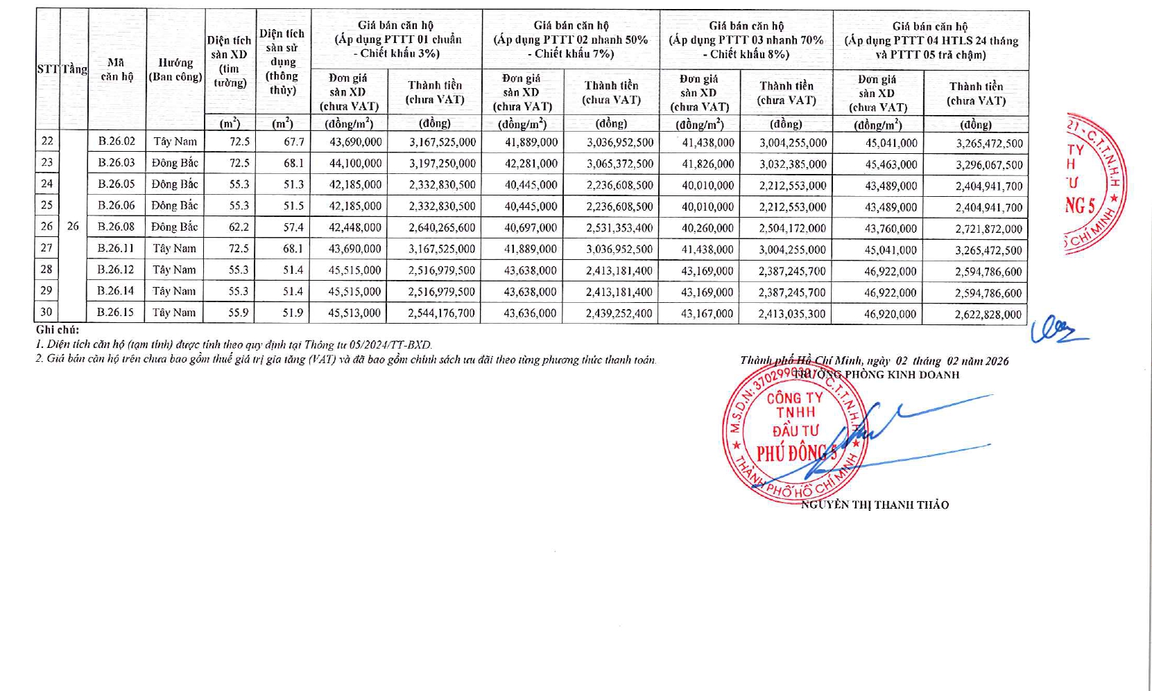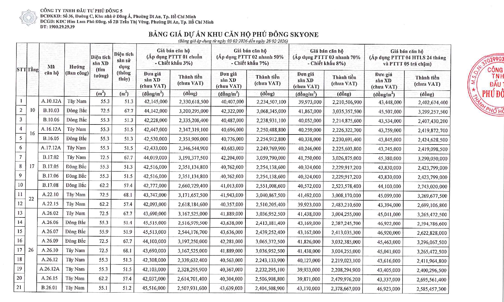 Cập nhật giá bán và phương thức thanh toán dự án Phú Đông SkyOne tháng 02/2026.