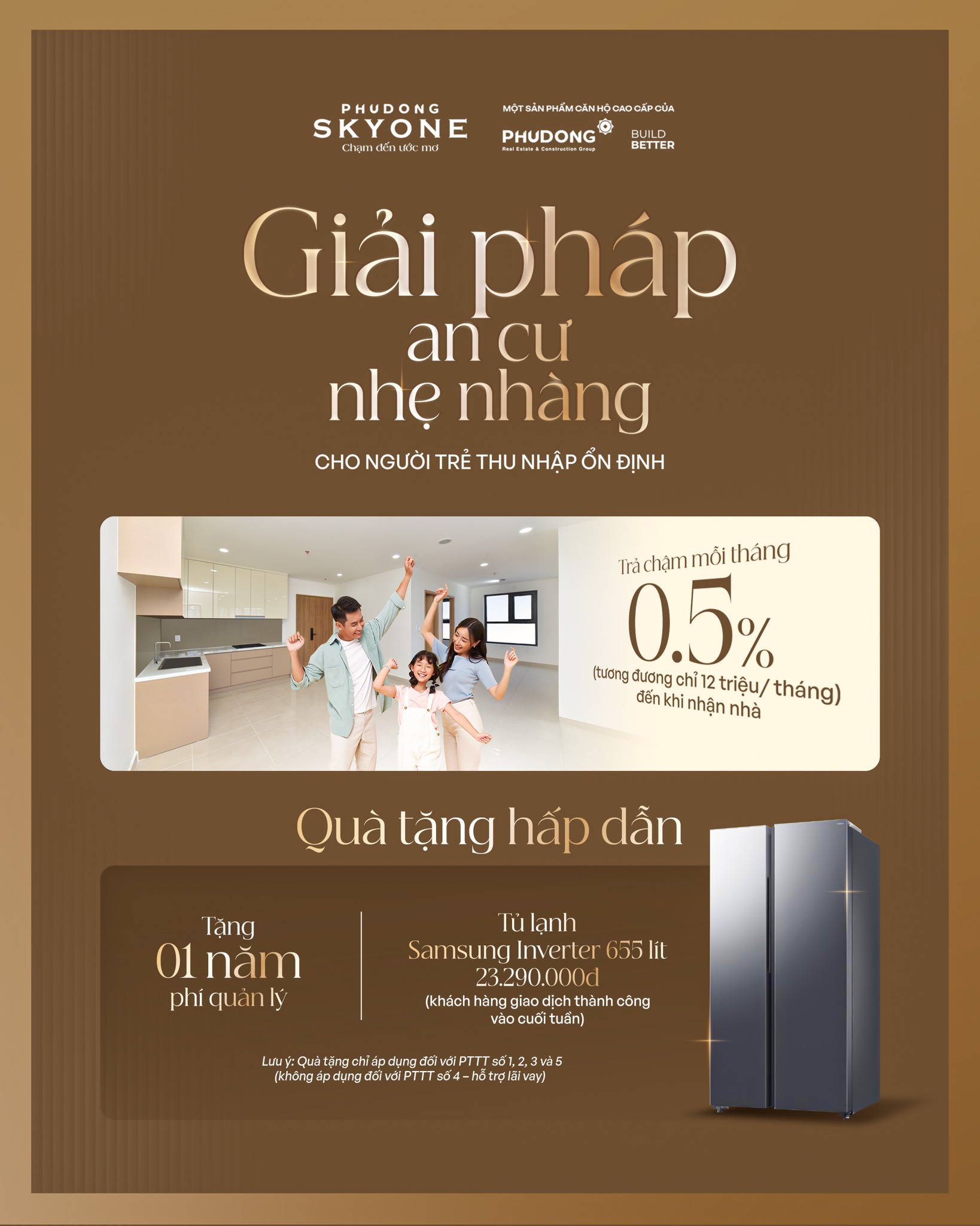 Phú Đông SkyOne mang đến giải pháp sở hữu nhà không cần vay ngân hàng, giúp người trẻ chủ động dòng tiền, trả góp nhẹ nhàng theo thu nhập hàng tháng mà không phải lo gánh nặng lãi suất.