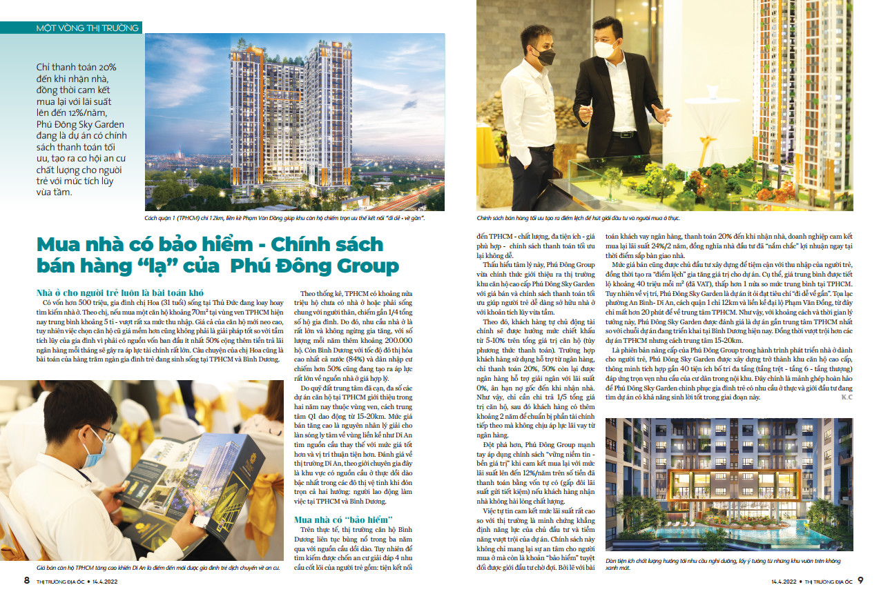 Xuất hiện trên Tạp chí Thị trường Địa ốc – Thời báo Kinh tế Sài Gòn số 4/2022, Phú Đông Sky Garden là phiên bản nâng cấp của Phú Đông Group trong hành trình phát triển nhà ở dành cho người trẻ. Đặc biệt, Phú Đông Sky Garden đang là dự án có chính sách thanh toán tối ưu, khi chỉ cần thanh toán 20% đến khi nhận nhà đồng thời cam kết mua lại với lãi suất lên đến 12%/năm.