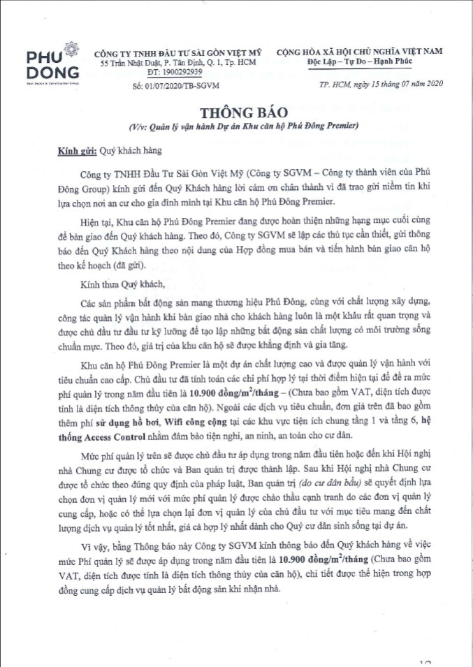 Công Ty TNHH Đầu Tư Sài Gòn Việt Mỹ (Công ty SGVM – Công ty thành viên của Phú Đông Group) kính gửi đến Quý khách hàng lời cảm ơn chân thành vì đã trao gửi niềm tin khi lựa chọn nơi an cư cho gia đình mình tại Khu căn hộ Phú Đông Premier.