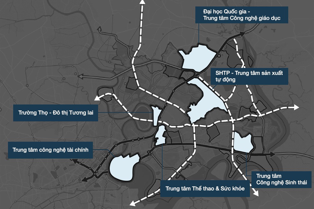 Tại TP.HCM, khu đô thị sáng tạo phía đông sẽ có các khu chức năng như trung tâm công nghệ sinh thái Tam Đa; khu đô thị Thủ Thiêm; khu đô thị tương lai Trường Thọ; trung tâm thể thao Rạch Chiếc…